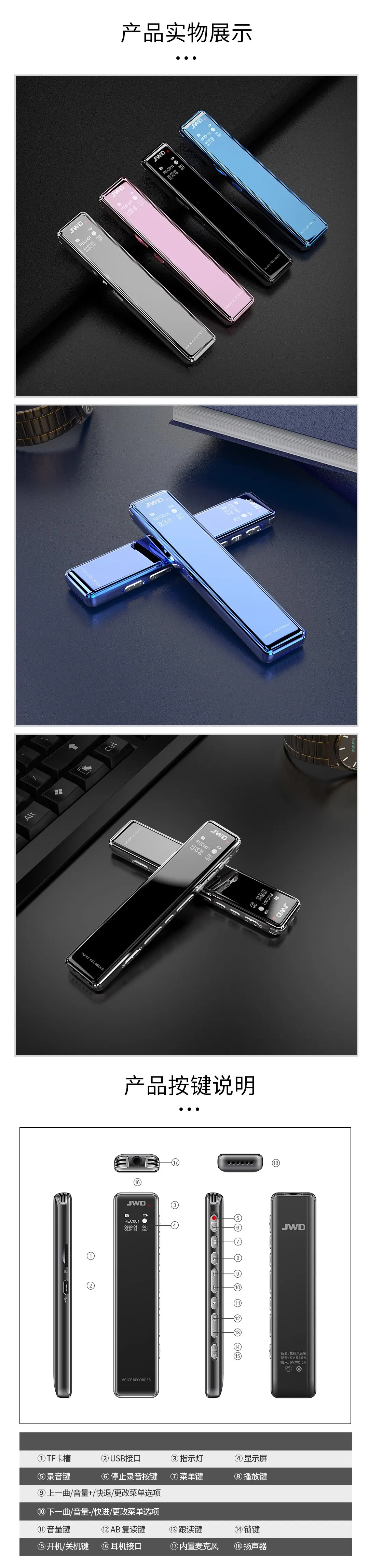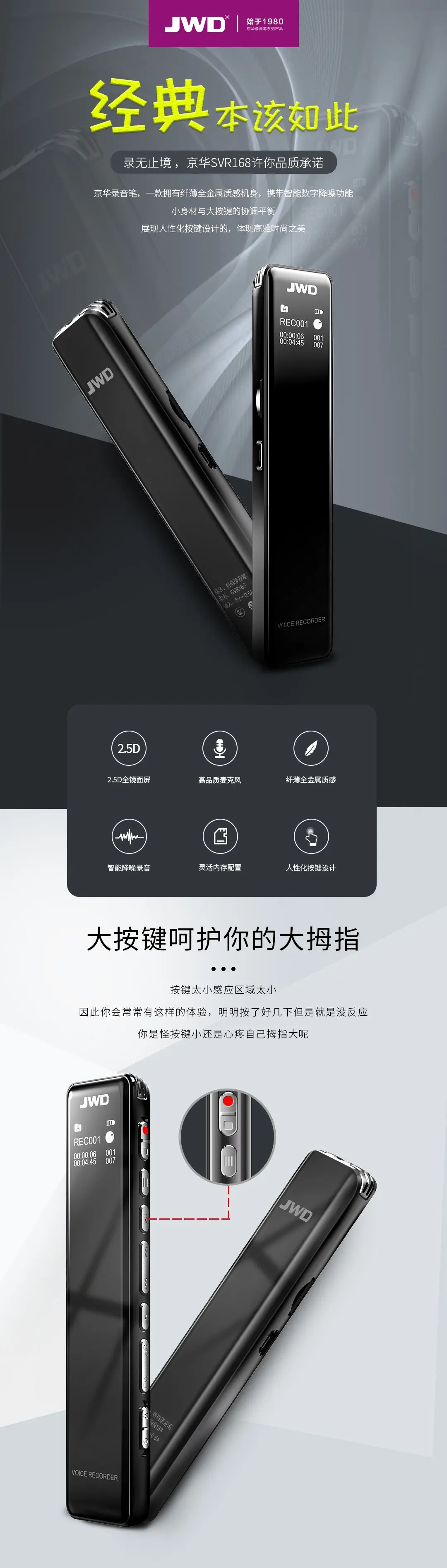 全金屬機體,智能數(shù)字化降噪輸入,聲控/定時/分段多樣錄音,四配色可選