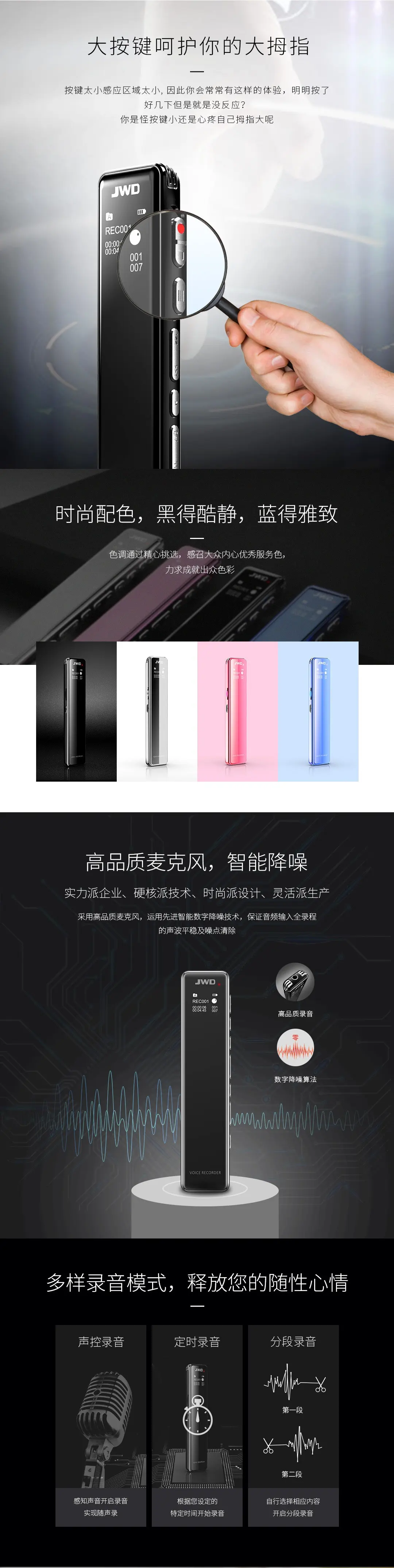 2.5D全鏡面顯屏,高品質(zhì)麥克風(fēng),支持TF卡取換,人性化按鍵設(shè)計,智能數(shù)字降噪